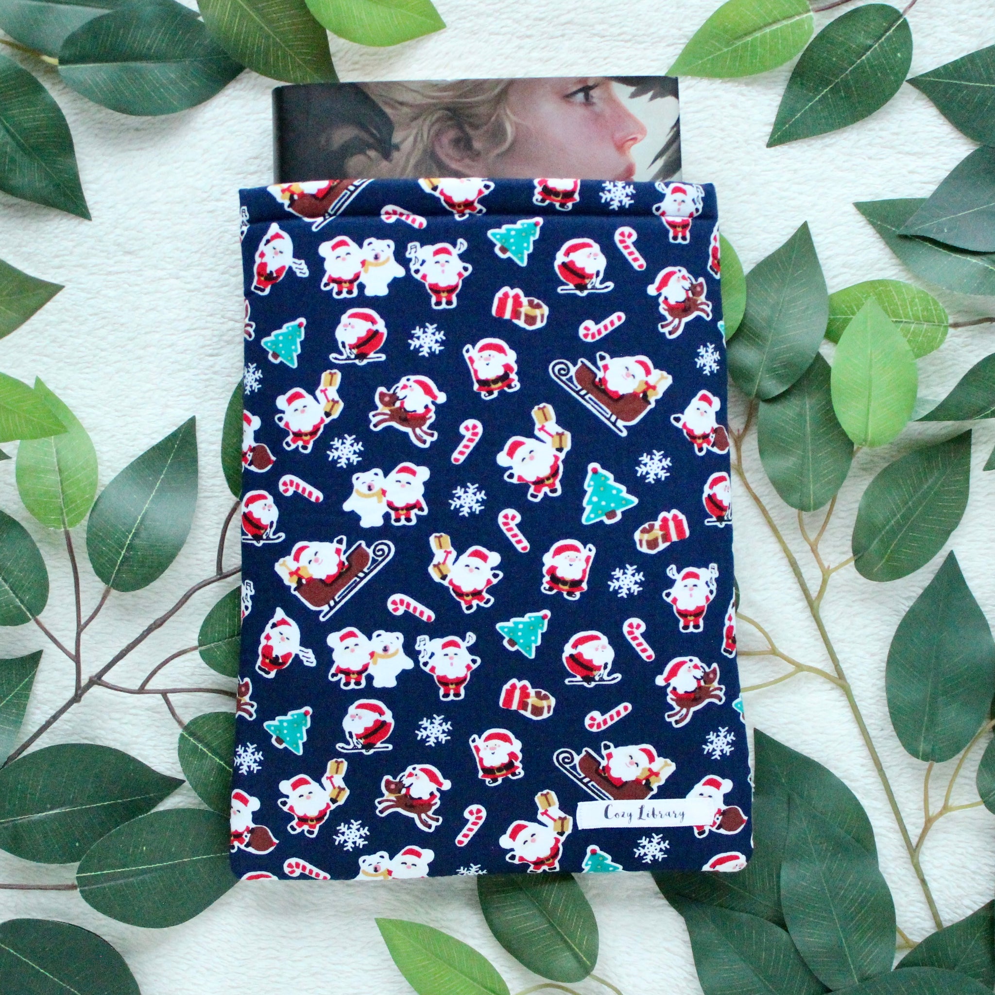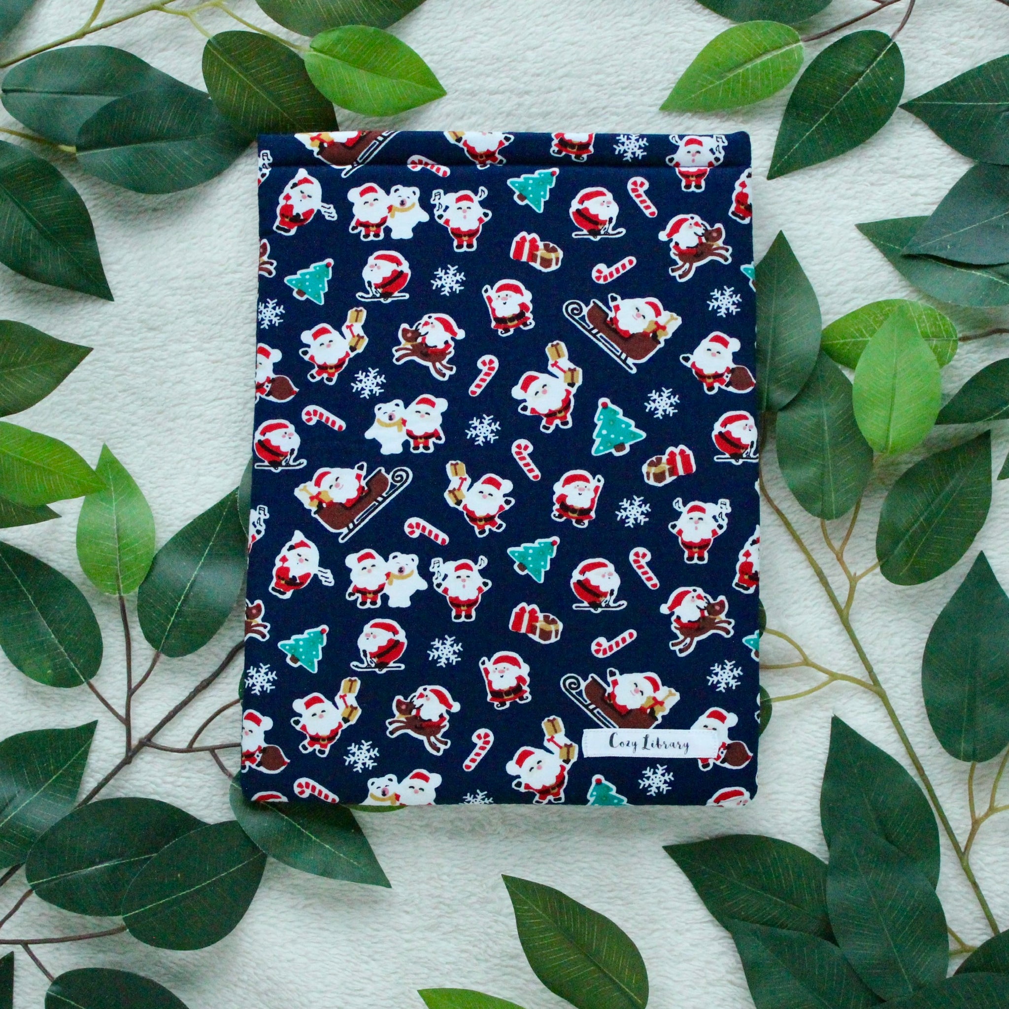 Keep your books safe and sound within this Jolly Santa book sleeve on your commute, or just in your everyday life!
